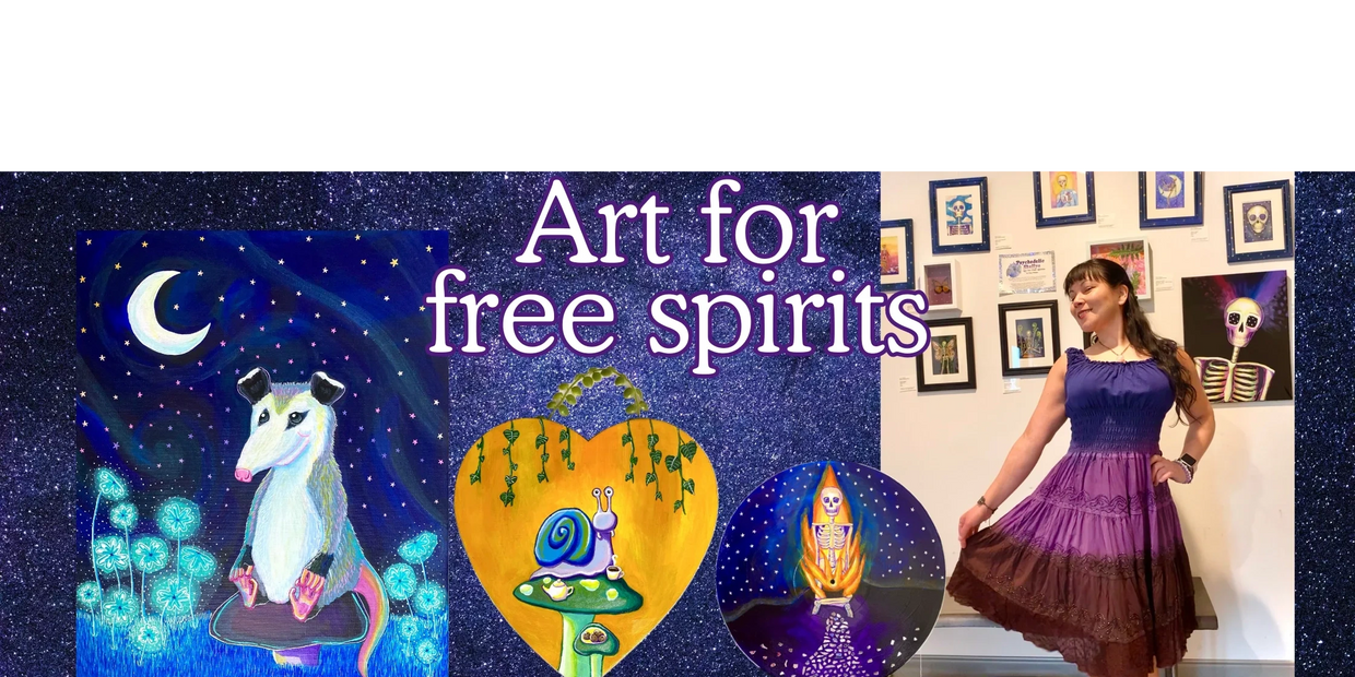 Pony has been drawing since she could hold a crayon. Her art has appeared in several galleries in Las Vegas's arts district. Though she studied drawing in college, as a painter, Pony is self taught. Her vivid use of color and highly imaginative subject matter create a unique and whimsical world of meditating skeletons, coffee sipping opossums and star gazing snails. You will see her love of nature in everything she creates.